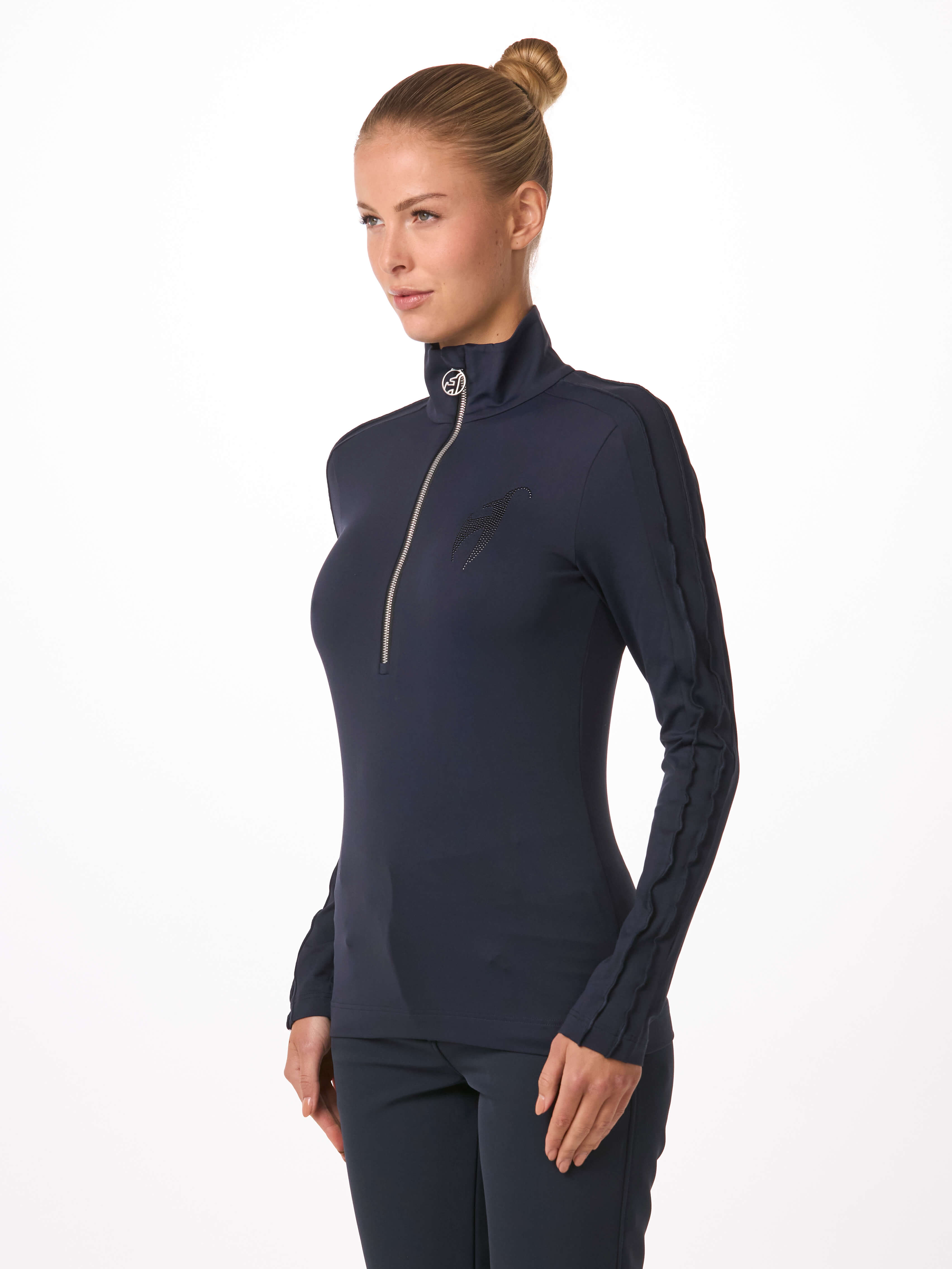 Luxury chic! With specially worked ruffles on the sleeves, the VRENI makes you look unique. Our first layer fabric provides warmth, coziness and 100% freedom of movement. A tonal metal hot fix logo completes its glamorous look.