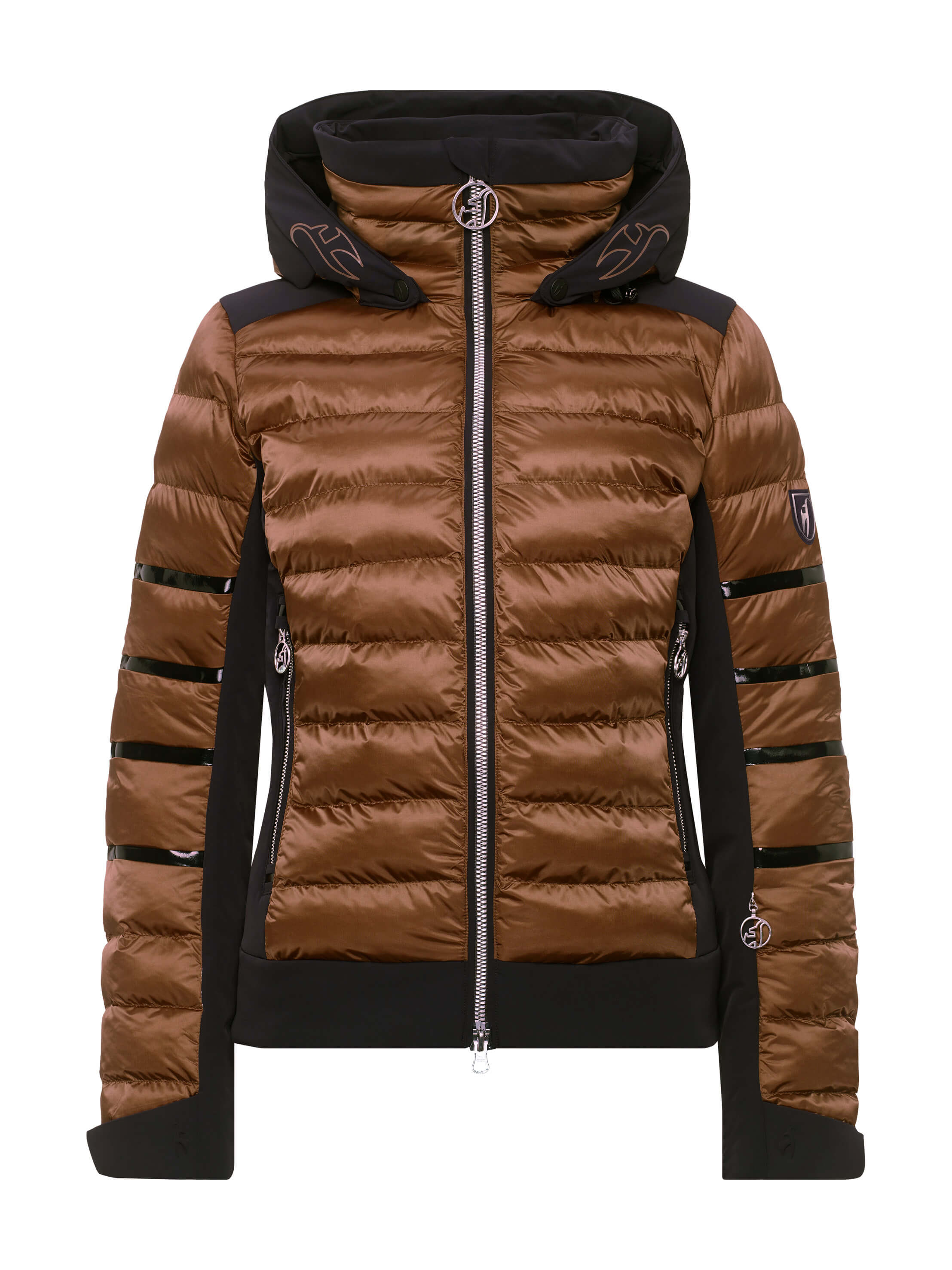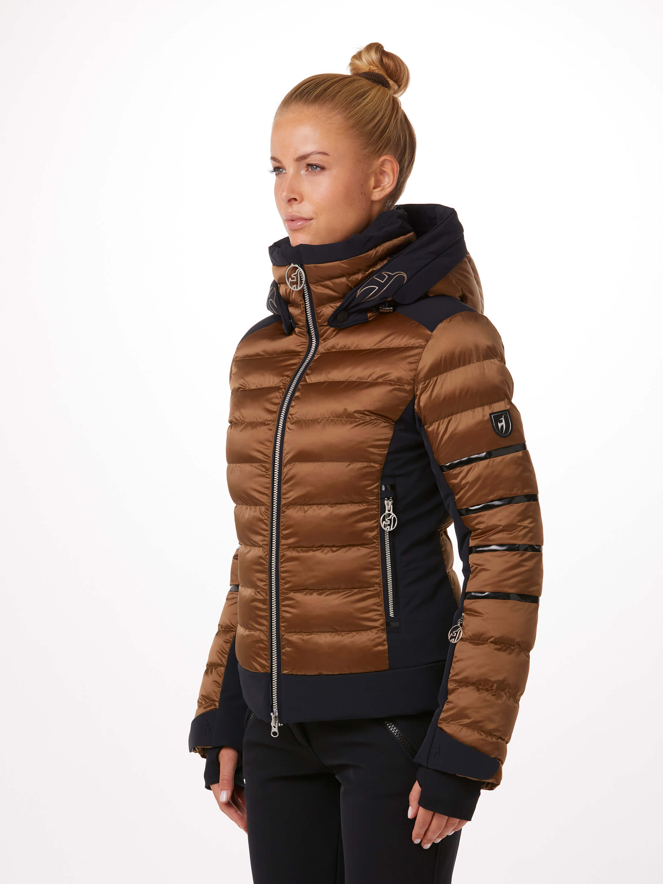 With its luxurious shine, the ADELE SPLENDID women’s ski jacket is a real eye-catcher for all alpine adventures. The combined materials – Shiny Pearl Nylon and Japanese Premium 4-way Stretch – defy the elements with a high-performance membrane. For consistent warmth, the chambers are hand-filled with SORONA® Fiberballs. The ski jacket is detailed with glossy accent stripes, YKK 2-way METALUXE® Mirror zippers, and various logo details.
