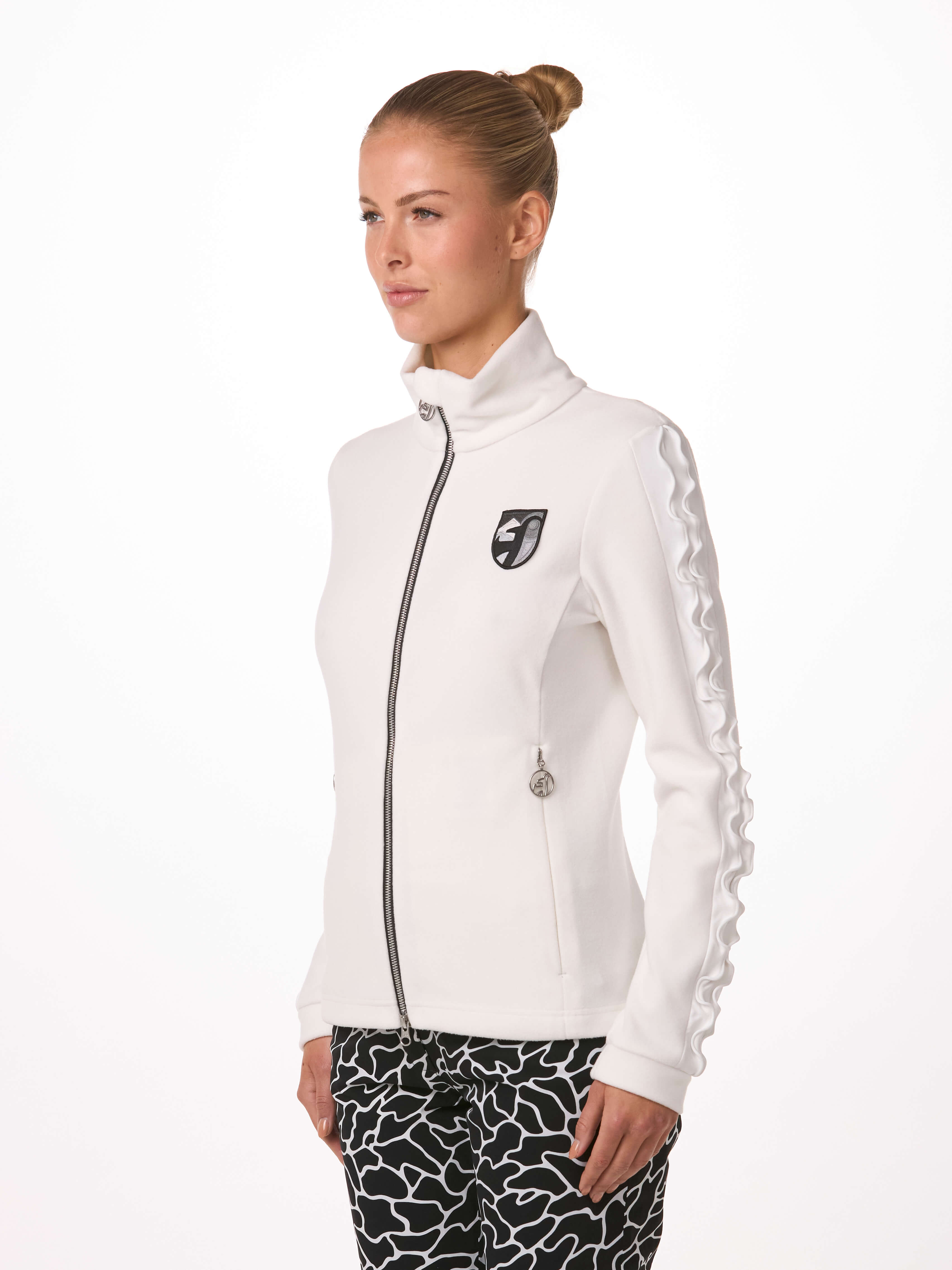 With feminine ruffle details on the sleeves and new embroidery patches, the CARINNE mid layer jacket is the perfect mix between fashion and function. Protecting you with warmth and comfort, the CARINNE is the best choice on the slopes or in the city.