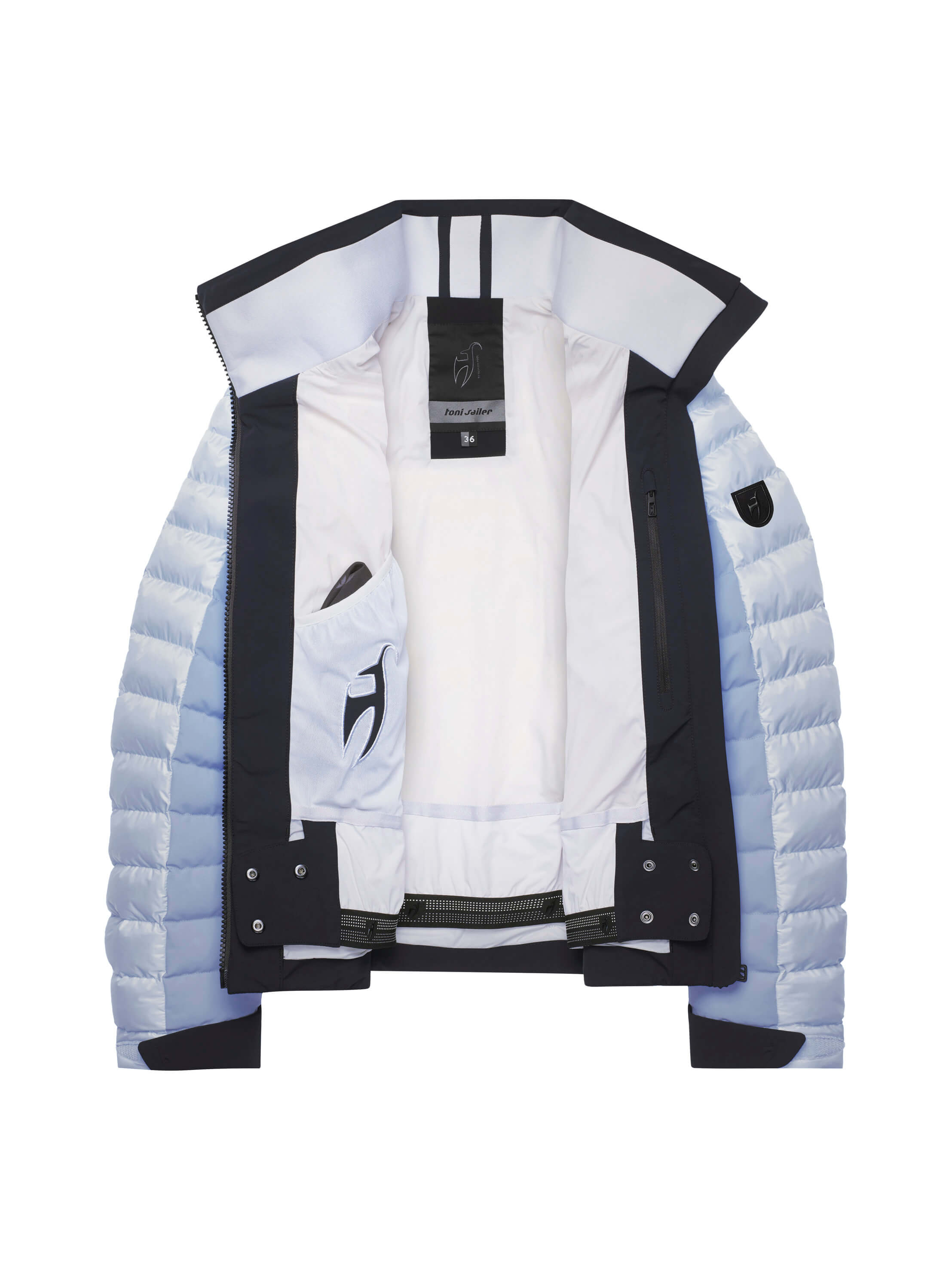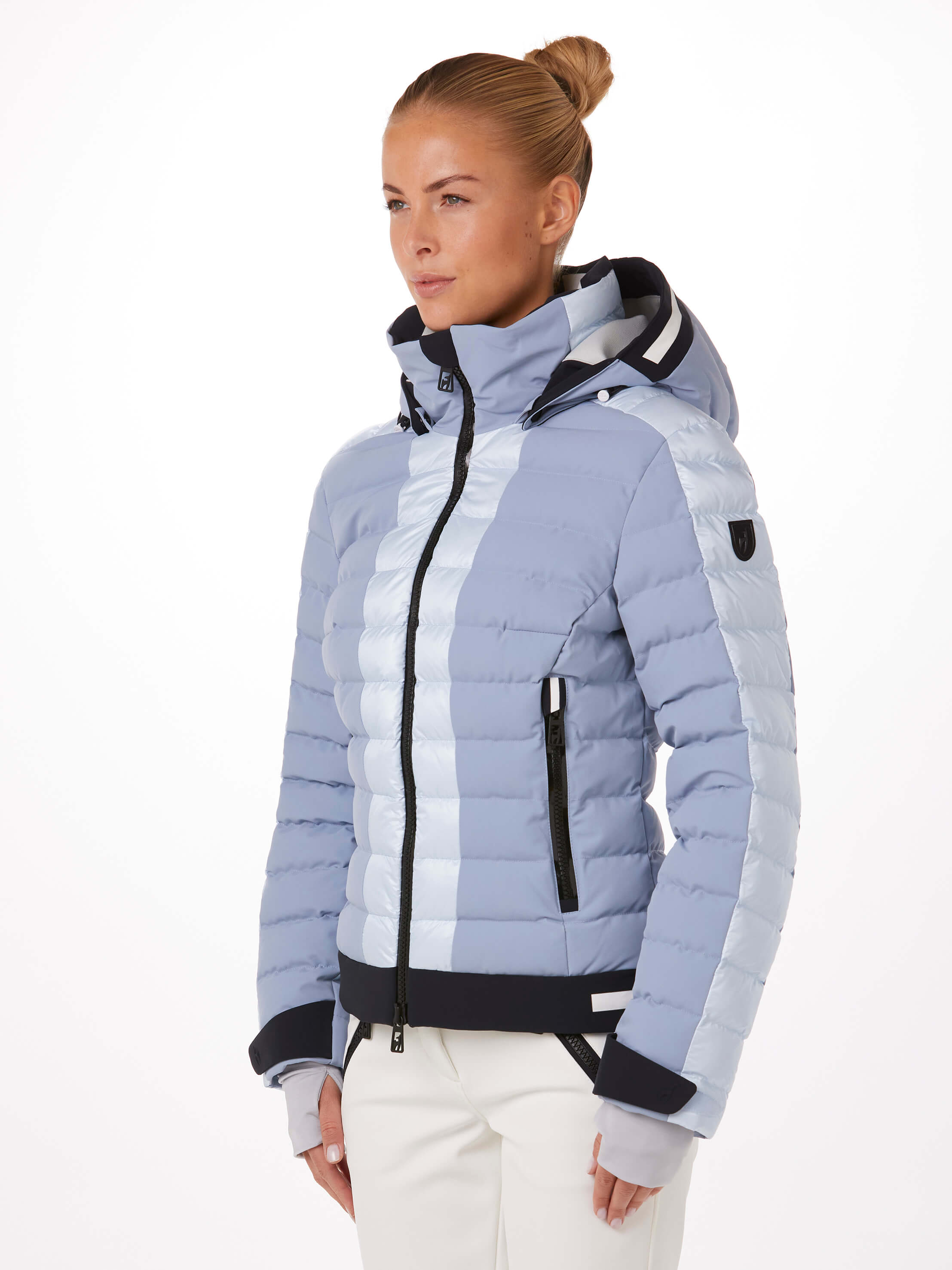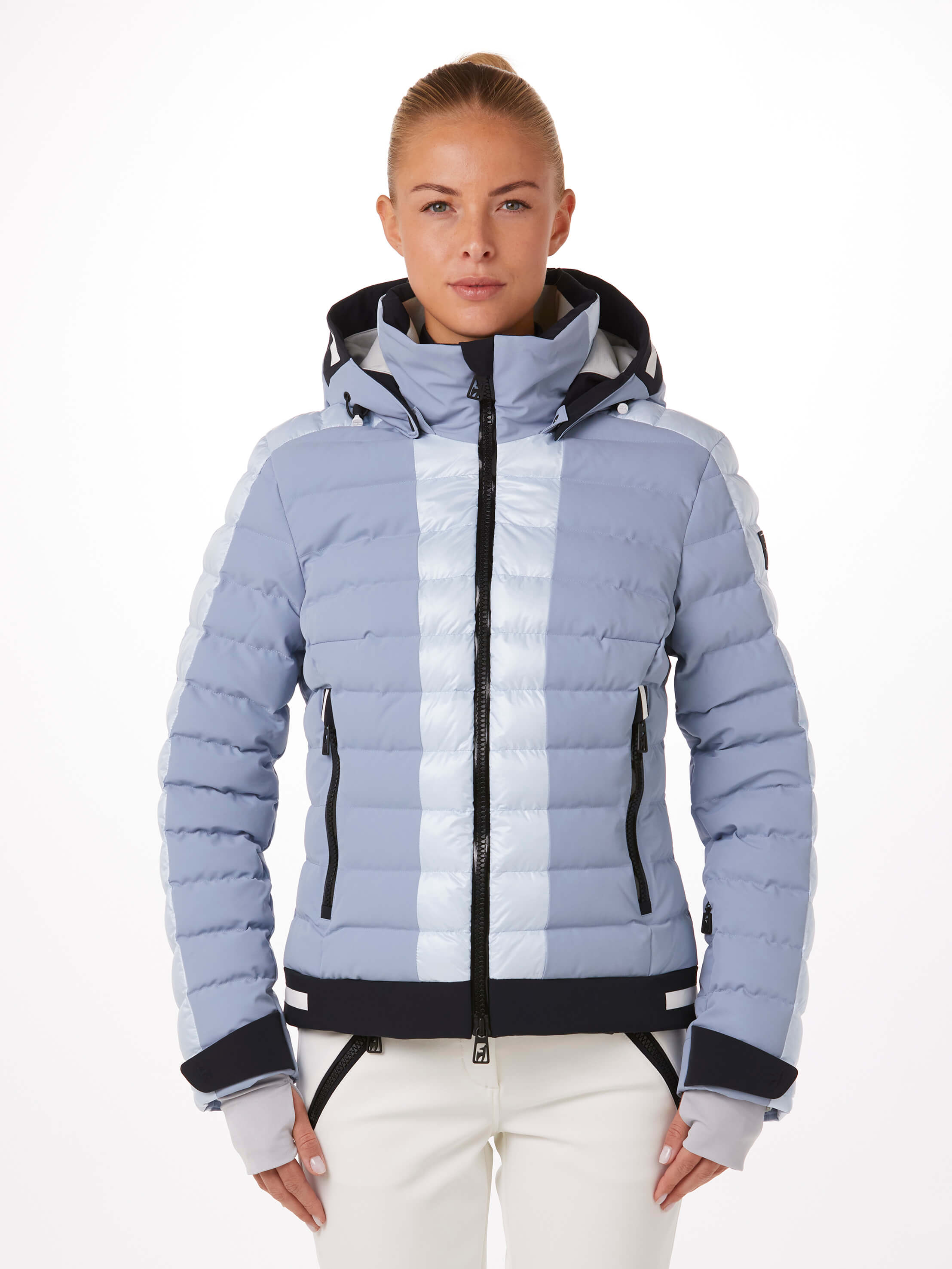 The NORMA women’s ski jacket, manually filled with heat-retaining SORONA® Fiberballs, combines a sporty look with a feminine silhouette. High functionality in all weather conditions is ensured with Japanese Premium 4-wayStretch and Shiny Nylon Ripstop Cire finish with a membrane, Z-Liner, and water-repellent finish. Each design element is perfectly coordinated for exceptional comfort. With super soft fleece lining inside the collar for a luxurious feel and the Toni Sailer logo at the back hem.